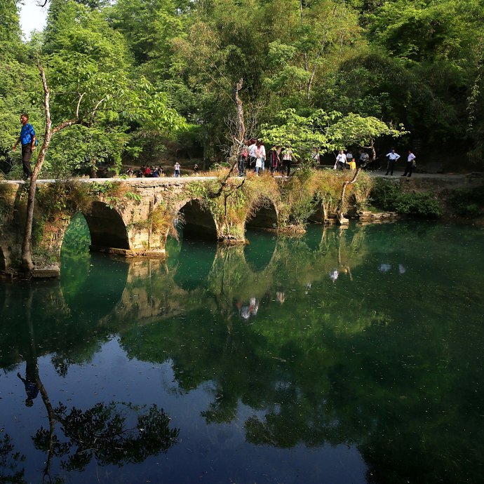 小七孔古桥:位于景区之首,景区之名由桥而得。这是一座小巧玲珑的七孔古石桥,桥长25米,桥面宽4米,拱高4米,建于清道光15(1836)年,昔为沟通荔波至广西的重要桥梁。桥由麻石条砌成,桥身爬满藤蔓和蕨类;古色古香的桥下是绿得令人心醉的涵碧潭。两岸古木参天,巨大的虬枝沿着桥伸臂,宛如巨伞撑在桥上。