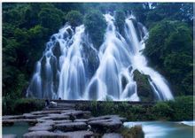 水上森林:亦名瑶池。长约600米,分上下两段。河谷里丛生着茂密的乔木和灌木,形成一道翡翠屏障。清澈的河水从河床的杂木林中穿涌而下。年复一年,日复一日的冲涮,河床已没有了一粒泥沙,连磐石也被激流磨光了棱角而变得"圆滑"起来,但树木却象多情的汉子,死死扎根在河床妻子的怀抱里,纹丝不动。美丽的爱情之树四季常青。这种"水在石上淌,树在水中长"的奇景,人见人叹。